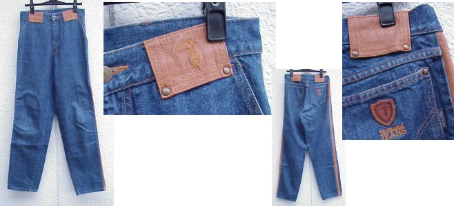 綿100、人工皮革使用、ウエスト76、総丈110、股下丈80、すそ幅19、
