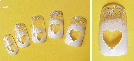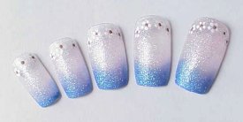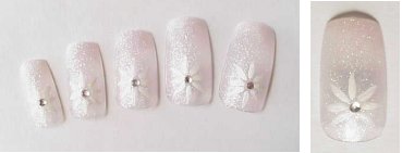チップの長さを調節します。ハサミでカットすると割れてしまう場合がありますから、なるべくヤスリで削るようにします。 根元側は自爪の甘皮カーブに合わせて削ると、つけた時自然にみえます。 爪が湾曲している方はチップをドライヤーで温め、表面の模様を傷つけないように曲げて調節します。 自爪に「つけ爪専用両面テープ」を貼ります。 チップの根元側を甘皮カープに合わせてゆっくり密着させるように押しつけていきます。 1時間くらいは水を避け、テープの粘着力が弱まらないように無理な力を加えないようにして下さい。